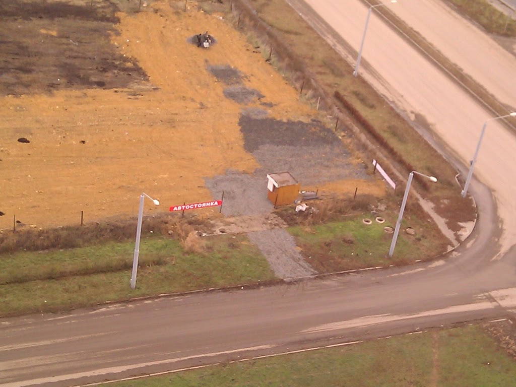 Рабочие пока ровняют гравий, сделан забор из рабицы и установлена будка-сторожка. Стоянка небольшая, машин на 50-70.
